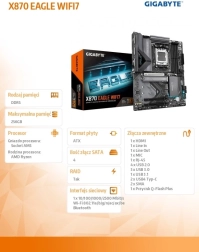Osnovna plošča GIGABYTE X870 EAGLE WIFI 7 za podnožje AMD AM5 podpira procesorje Ryzen 9000/8000/7000, ponuja PCIe 5.0, trojico M.2 rež, hitro omrežje 2.5GbE + Wi‑Fi 7 in priročne funkcije EZ-Latch za brezvijačno namestitev. Stabilno napajanje zagotavlja 14+2+2 VRM, učinkovito hlajenje pa VRM Thermal Armor in M.2 Thermal Guard. Za zahtevne igralce in ustvarjalce prinaša enostavno enoklikno pospeševanje DDR5 ter bogato povezljivost, vključno z dvojnima USB4 Type‑C in HDMI.