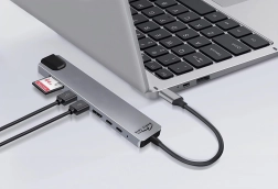 Kompaktna priklopna postaja 8 v 1 podjetja Media‑Tech razširi vaš prenosnik z Gigabit Ethernetom, HDMI 4K, USB‑A 3.0 do 5 Gb/s, USB‑C Power Delivery 100 W ter čitalnikoma SD/microSD. Elegantno aluminijasto ohišje je lahko in odporno, idealno za na pot in za pisalno mizo.