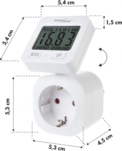 Upravljanje je intuitivno – na voljo sta 2 funkcijska gumba za hitro preklapljanje načinov. Vrtljiv, dobro čitljiv zaslon zagotavlja odlično vidnost podatkov v vsakem položaju. Naprava prenese obremenitev do 3680 W, zato brez težav meri tudi zahtevnejše naprave, kot so pralni stroj, sušilnik ali računalnik.
