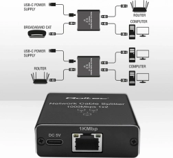 Namestitev je hipna – tehnologija Plug & Play ne zahteva gonilnikov ali napredne konfiguracije. Dovolj je, da vhod povežete z usmerjevalnikom ali modemom, izhoda pa s ciljnimi napravami. Indikacijske LED-diode jasno prikazujejo aktivnost vrat, tako da imate pregled nad stanjem omrežja.