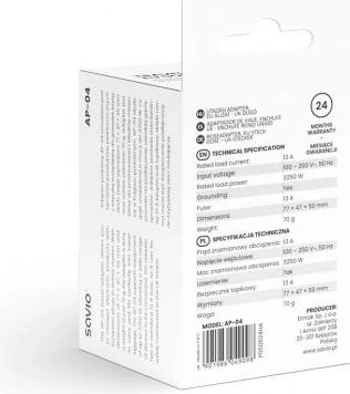 Varnost je ena glavnih prednosti tega adapterja. Opremljen je z ozemljitvijo in zamenljivim varovalkom z vrednostjo 13 A, kar zagotavlja visoko raven zaščite. Kakovostna izdelava in trpežni materiali zagotavljajo zanesljivost in dolgo življenjsko dobo adapterja.