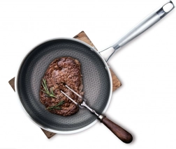 Jeklena »satasta« tekstura ščiti površino pred praskami tudi pri uporabi kovinskih pripomočkov ter omogoča lahko sproščanje jedi.