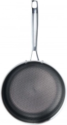 Robustna ponev iz nerjavnega jekla s premerom 26 cm je zasnovana za natančne rezultate in dolgo življenjsko dobo. Trislojno sendvič dno združuje zunanjo magnetno nerjavno jeklo 430, aluminijasto jedro za odlično prevajanje toplote ter notranjo živilsko nerjavno jeklo 304. Teksturirana površina s heksagonalnim “satastim” vzorcem povečuje odpornost proti praskam in prispeva k neprijemljivosti.