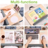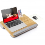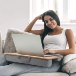 Ta prenosni namiznik ponuja udobno in ergonomsko rešitev za uporabo prenosnika izven mize. Robustna MDF plošča z naravnim videzom lesa zagotavlja stabilno podlago, medtem ko se mehko oblazinjenje prilagodi vašim kolenom za maksimalno udobje in manj tresljajev pri tipkanju.