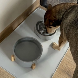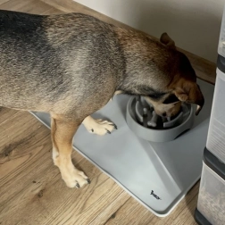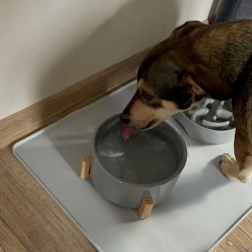 Protizdrsno dno preprečuje premikanje posod, tudi ko vaš pes je z navdušenjem. Podloga se preprosto umiva – dovolj je splakniti in obrisati s krpo. Velikost 60 × 40 cm nudi dovolj prostora za dve posodi različnih velikosti.