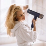 Negativni ioni zmanjšujejo statično elektriko, zgladijo površino las in pomagajo omejiti kodranje. Po sušenju so lasje mehki, prožni in bleščeče sijoči.