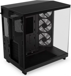 NZXT H6 Flow RGB v črni barvi združuje elegantno panoramsko zasteklitev z optimiziranim pretokom zraka. Dvokomorna zasnova loči napajalnik in kable od glavnih komponent, kar izboljša temperature ter ohranja čist, profesionalen videz sistema. Perforirani zgornji in stranski paneli podpirajo visok pretok in hkrati zadržujejo prah.