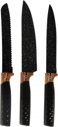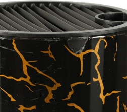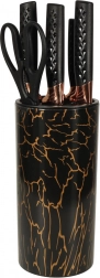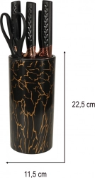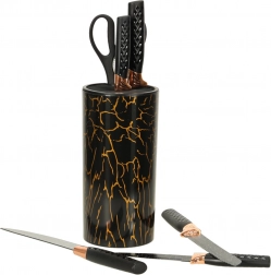 Odkrijte izjemen dizajn s črnimi in medenimi poudarki, ki izboljšajo videz vaše kuhinje. Marmorno stojalo zagotavlja praktično in estetsko shranjevanje, ki ohrani vaše nože organizirane in enostavno dostopne.