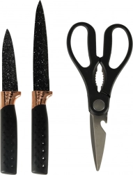 Razveselite se s tem setom, ki vsebuje pet nožev, škarje in čudovito marmorno stojalo. Ostri rezili iz nerjavečega jekla zagotavljata dolgotrajno delovanje in vzdržljivost. Ergonomski ročaji zagotavljajo udoben oprijem, naj bo to pri rezanju kruha ali pripravi zelenjave.