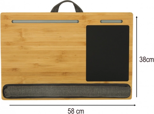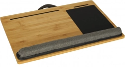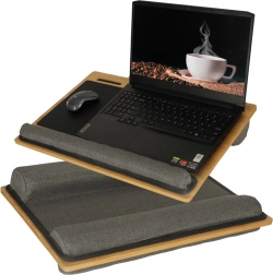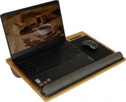 Elegantna lesena mizica za na kolena združuje udobje, funkcionalnost in vzdržljivost. Naravna lesena plošča je trdna in prijetna na dotik, medtem ko se mehko blazinjeno dno prilagodi vašim kolenom ter zagotavlja stabilnost brez drsenja. Ergonomski naslon za zapestje zmanjšuje utrujenost pri daljšem delu s prenosnikom.