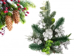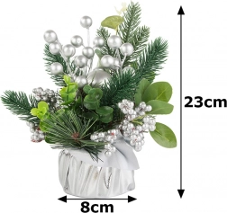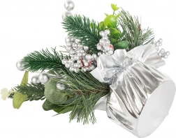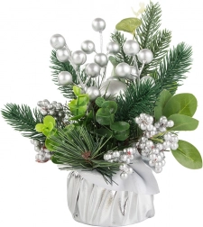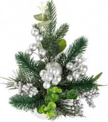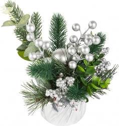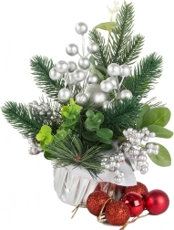 Privoščite si praznično vzdušje s to čudovito božično dekoracijo, ki združuje umetniško izdelavo in eleganco. Srebrne krogle in okraski dekoraciji dajejo eleganten, zimski videz, ki se popolnoma poda k tradicionalnim božičnim okraskom. Celoten kos je ovitega v srebrno tkanino, kar ustvari usklajen in stilski celoten vtis.