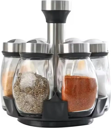 - Komplet 6 prozornih posod za začimbe s posebno vrtljivo osnovo.