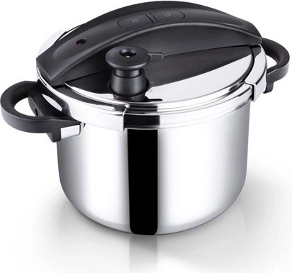 Pokrov se odpira s pritiskom na gumbe z eno roko, zato je delo v kuhinji hitro in udobno. Vgrajen manometer in večstopenjski varnostni ventili prinašajo mir pri kuhanju, medtem ko sendvič dno enakomerno porazdeljuje toploto na vseh štedilnikih, vključno z indukcijskimi kuhalnimi ploščami.