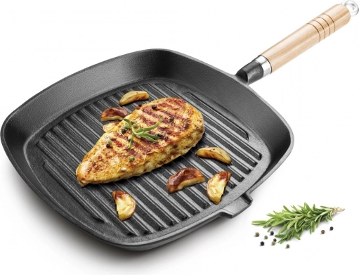 Litoželezna žar ponev je idealna za pripravo sočnih steakov, zelenjave in rib. Kakovostno litoželezo zagotavlja odlično akumulacijo in enakomerno prevodnost toplote, zato se sestavine pečejo enakomerno in ostanejo sočne. Notranje rebrasto dno ustvarja značilne žar proge in omogoča kuhanje z minimalno količino olja.
