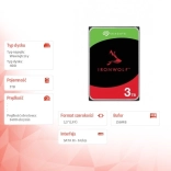 Disk IronWolf s kapaciteto 3 TB je zasnovan za potrošniške in komercialne NAS sisteme ter zagotavlja vzdržljivost, zanesljivost in razširljivost v večležiščnih okoljih s celodnevno aktivnostjo.
