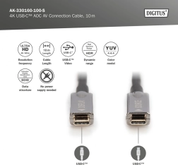 Aktivni hibridni kabel USB‑C–USB‑C za prenos nestisnjene slike in zvoka do UHD 4K @ 60 Hz s prepustnostjo do 21,6 Gbit/s. Zahvaljujoč optično‑bakreni zasnovi je lahek, upogljiv in odporen na EMI, idealen za daljše razdalje (10 m). Podpira DisplayPort 1.2 in USB‑C DP Alt Mode, deluje po principu plug and play brez zunanjega napajanja.