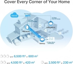 Sistem Deco X50-PoE podpira Wi-Fi 6 z dvopasovno povezavo za hitrosti do 2402 Mbps na 5 GHz in 574 Mbps na 2,4 GHz, kar zagotavlja gladko pretočno predvajanje in igranje iger.