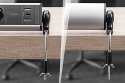 Dve sponi omogočata hitro montažo brez vrtanja na delovne površine debeline 20–57 mm. Po pritrditvi lahko trak vodoravno vrtite za 180°, tako da vedno nastavite idealen dostop do vtičnic in USB‑priključkov.