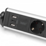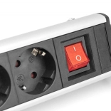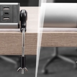 V kompletu sta dve robustni sponi za hitro pritrditev na namizno ploščo debeline 20–57 mm brez vrtanja. Po pritrditvi lahko trak vodoravno vrtite za 180° in tako nastavite idealen dostop do vtičnic in USB‑priključkov. Za varno delovanje sta tu osvetljen glavni izklopnik in zaščita za otroke v ozemljenih vtičnicah.