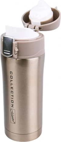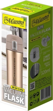 Slogoven in praktičen termo lonček MAESTRO GOLD s prostornino 320 ml ohranja vaše napitke vroče do 12 ur in hladne do 24 ur. Zahvaljujoč vakuumski izolaciji, dvojni steni in ohišju iz nerjavnega jekla 18/10 je vzdržljiv, eleganten in idealen za na pot. Zaklepni pokrov z gumbom in ustnikom zagotavlja varno in udobno pitje brez polivanja.