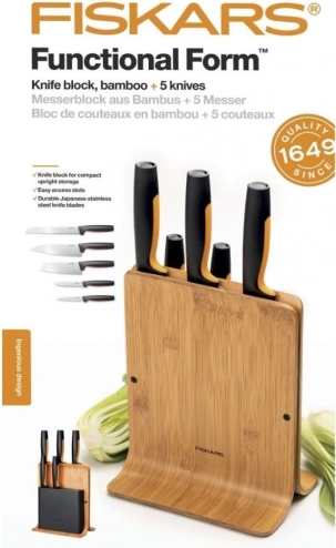 Praktičen komplet kuhinjskih nožev v elegantnem bambusovem bloku ponuja varno in udobno shranjevanje, ostre rezila iz nerjavnega jekla ter ergonomske ročaje. Sodoben finski dizajn in modularna razporeditev zagotavljata enostaven dostop do vsakega noža, vključno s prostorom za škarje.