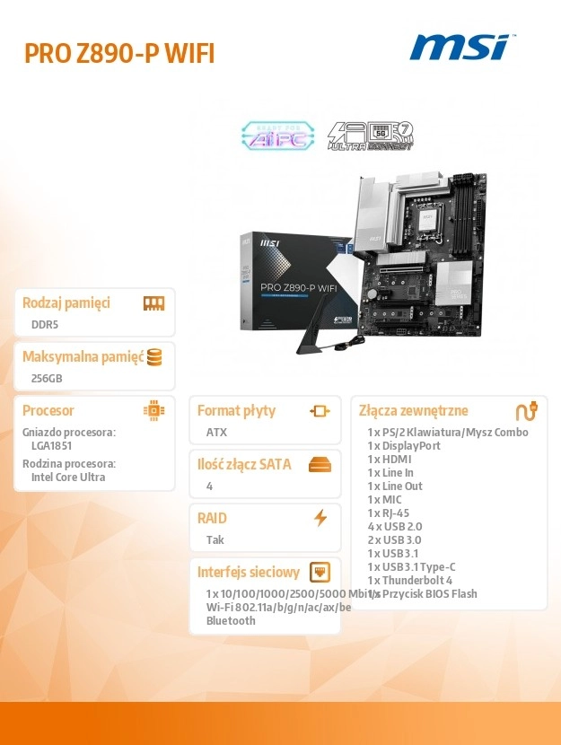 MSI PRO Z890-P WIFI je idealna osnovna plošča za vaš nov zmogljiv računalnik. S podporo za tehnologijo Wi-Fi 7 in Thunderbolt 4 zagotavlja maksimalno povezljivost in hitrost.