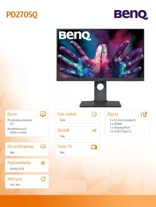 Profesionalni 27" monitor z ločljivostjo QHD ponuja oster prikaz, verne barve IPS in široke možnosti povezovanja, vključno s HDMI, DisplayPort in USB. Hiter odziv 5 ms ter udobne funkcije za delo in zabavo iz njega delajo idealno izbiro za pisarno, grafiko in multimedijo.