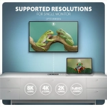 Izhod HDMI zagotavlja kakovostno sliko do ločljivosti 8K/30Hz in 4K/120Hz Ultra HD, vključno z večkanalnim zvokom. Podprte so visoke frekvence osveževanja v priljubljenih igralnih ločljivostih do 240Hz. Za pravilno delovanje je potreben priključek USB-C ali Thunderbolt 3/4 z aktivnim načinom DisplayPort (DP Alt Mode).