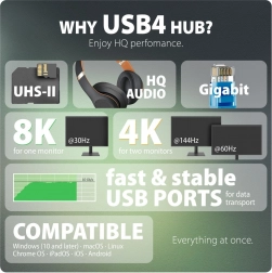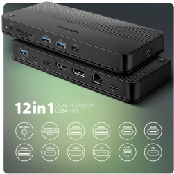 Dokovna postaja AXAGON HMC-U4 12-v-1 razširi vaše naprave s ključnimi vrati za delo in zabavo. Podpira USB4 in Thunderbolt združljivost, zato obvlada zahtevne podatkovne, video in napajalne povezave. Priključite 2 zunanja monitorja prek HDMI in DisplayPort z ločljivostjo do 8K/30 Hz ali 4K/144 Hz, izkoristite gigabitni ethernet za stabilno omrežje in prenašajte datoteke s hitrostjo do 10 Gb/s prek USB-C/USB-A.
