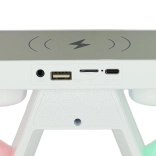 Večfunkcijska RGB svetilka v beli izvedbi združuje sodoben dizajn s praktičnimi funkcijami, kot so brezžično polnjenje, Bluetooth zvočnik, FM radio in budilka.