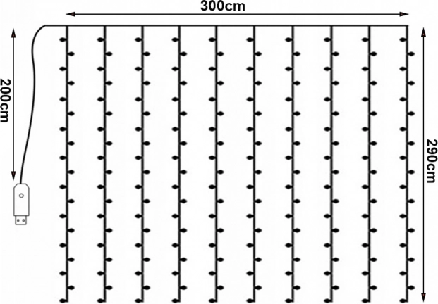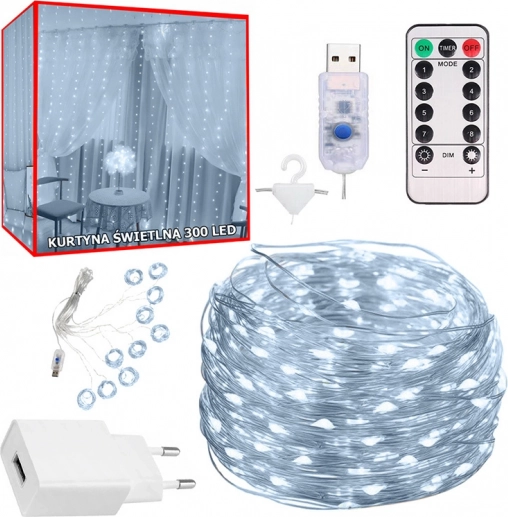 Svetlobna LED zavesa 300 LED, 3 × 2,9 m, hladno bela, daljinsko upravljanje, USB