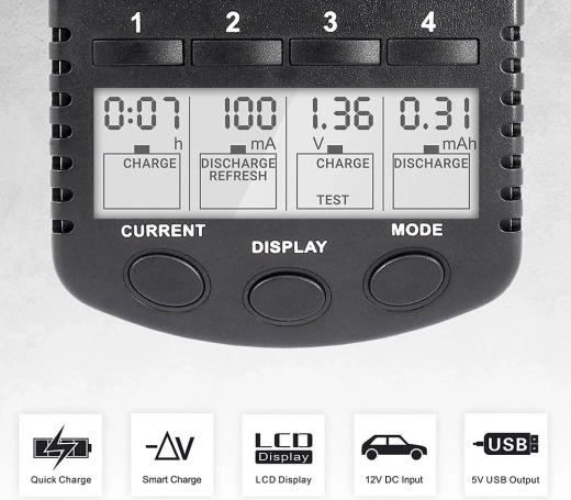 Z integriranimi načini omogoča ne le polnjenje, temveč tudi praznjenje in test kapacitete. Prilagojen način praznjenja/testiranja zna preveriti in zabeležiti kapaciteto katere koli celice v območju 1,2–1,6 V (vključno z alkalnimi in Ni‑Zn) – praktično za primerjavo dejanskega stanja baterij. Informativni LCD-zaslon sproti prikazuje ključne podatke in olajša nadzor procesa.