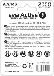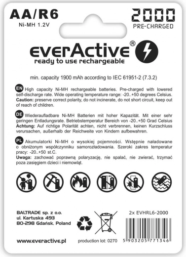 Polnilne baterije AA 2000 mAh s tehnologijo Ready To Use so idealne za vsakodnevno uporabo v daljinskih upravljalnikih, igračah, svetilkah in fotoaparatih. Zaradi prednapolnjenosti jih lahko takoj vzamete iz blistra in uporabljate, brez potrebe po prvem polnjenju.