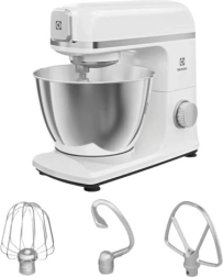 Balonasta metlica za rahlo stepanje, ploski mešalnik za kreme in bolj suhe zmesi ter kavelj za testo za popolno gnetenje kruha ali pice.
