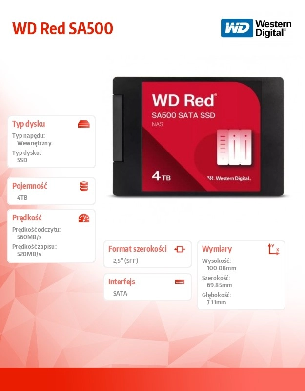 WD Red SA500 NAS SSD je ustvarjen za omrežne shrambne naprave, kjer sta ključni stabilnost in hiter odziv. Optimizirano predpomnjenje v NAS zagotavlja hiter dostop do najpogosteje uporabljenih podatkov in tekoče delo tudi pri visoki obremenitvi.