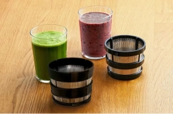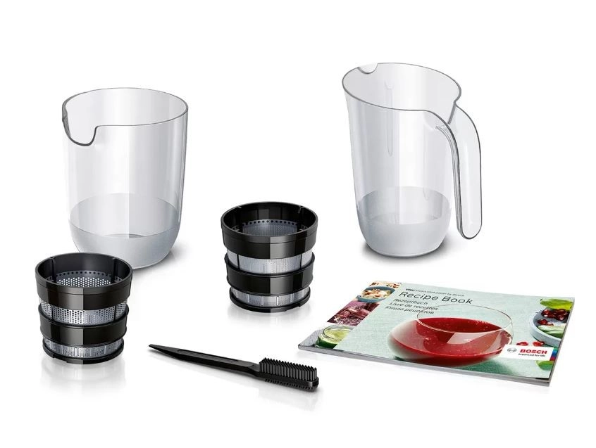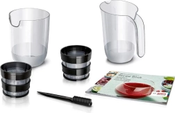 Vsi plastični deli, ki prihajajo v stik z živili, so brez BPA in jih je mogoče udobno pomivati v pomivalnem stroju. Vzdržljiv, zelo tih 150 W motor s približno 55 obr./min zagotavlja visoko izplenjenost soka z minimalnim hrupom. Priložena je tudi knjiga receptov z idejami za sokove, smutije in zdrave napitke.