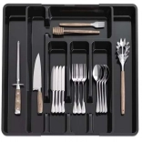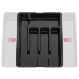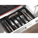 Praktičen črn organizator za predal z raztegljivim mehanizmom se zlahka prilagodi širini predala in ohrani ves pribor ter kuhinjski pripomočki na svojem mestu. Izdelan je iz odpornega PP, ima gladko površino za enostavno čiščenje in ponuja do 7 preglednih prekatov. Idealen za univerzalno uporabo, hitro organizacijo in moderen videz v vsaki kuhinji.