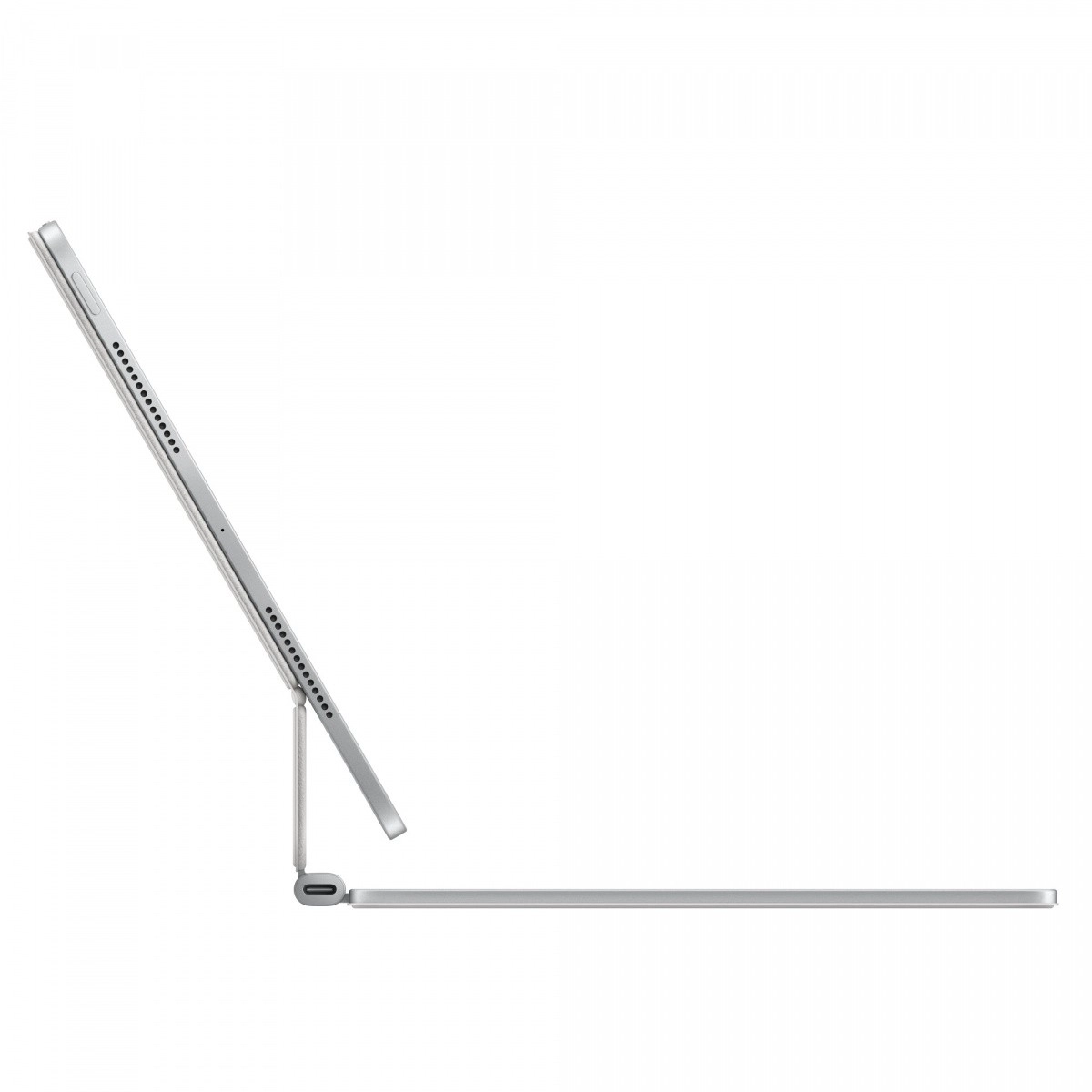 Polnovredna tipkovnica z osvetlitvijo in natančnim škarjastim mehanizmom (hod 1 mm) je tiha in udobna tudi pri dolgem tipkanju. Vrsta 14 funkcijskih tipk pospeši delo – od svetlosti in glasnosti do drugih uporabnih bližnjic. Vgrajeni USB‑C v tečaju služi za polnjenje, zato je priključek na iPadu prost.
