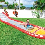 Uživajte v poletni zabavi na polno s to veliko napihljivo dirkalno stezo s toboganom in dvema blazinama v slogu dirkalnih avtomobilov. Vsaka blazina ima trdne ročaje za varno držanje, drsno površino lahko navlažite s priklopom vrtne cevi, celoten komplet pa ima nosilnost 100 kg. V paketu je priložen tudi popravni obliž. Primerno za otroke od 6 let.
