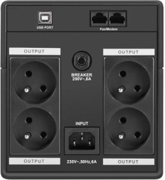 Štiri izhodne vtičnice 230 V (tip E – francoske) omogočajo sočasno napajanje več naprav. Pregledni LED indikatorji obveščajo o stanju Backup/Normal/Overload, medtem ko USB vmesnik s programsko opremo PowerManager II ponuja nadzor in varno ugašanje sistema.