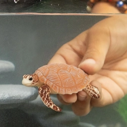 Debel oklep čopaste želvice je rdečerjave barve, ki izstopa na ozadju temnomodre barve oceana. Sprednje in zadnje noge tega črnookega plazilca imajo prav tako rjave in rumene vzorce. Videti je res čudovito, ko plava sredi morske pene. Morda nam bo dovolila, da jo opazujemo od blizu, če ji ponudimo pogostitev?