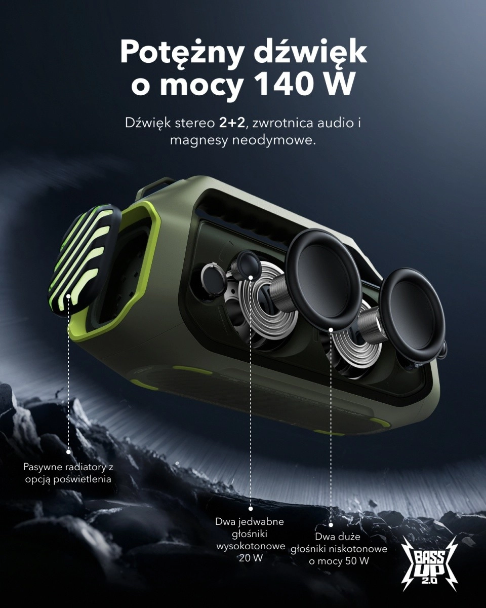 Soundcore Boom 2 Plus je zasnovan za zabavo na prostem: prinaša čist in glasen stereo zvok z izrazitimi detajli zahvaljujoč titanovim membranam s frekvenčnim odzivom do 40 kHz. Ekskluzivni BassUp v realnem času analizira glasbo in ojača nizke frekvence za resnično mogočne base brez popačenja.