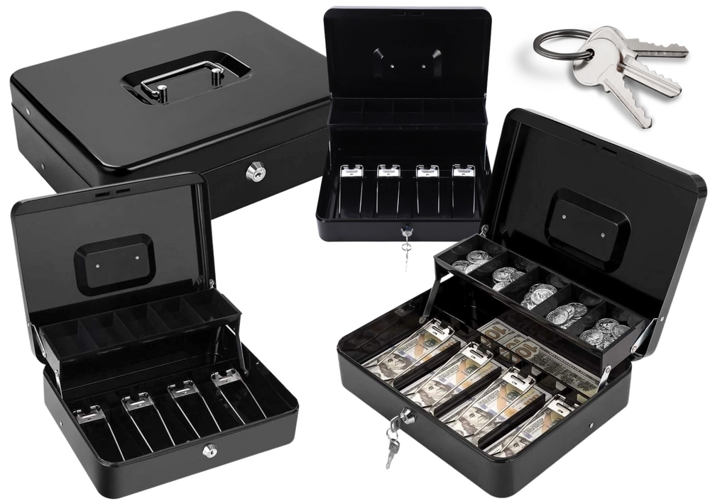 Kompaktna in varna črna kovinska blagajna z več predalčki ter dvopoložajno ključavnico. Idealna za upravljanje gotovine, nakita in dokumentov. Popolna za mala podjetja in gospodinjstva.
