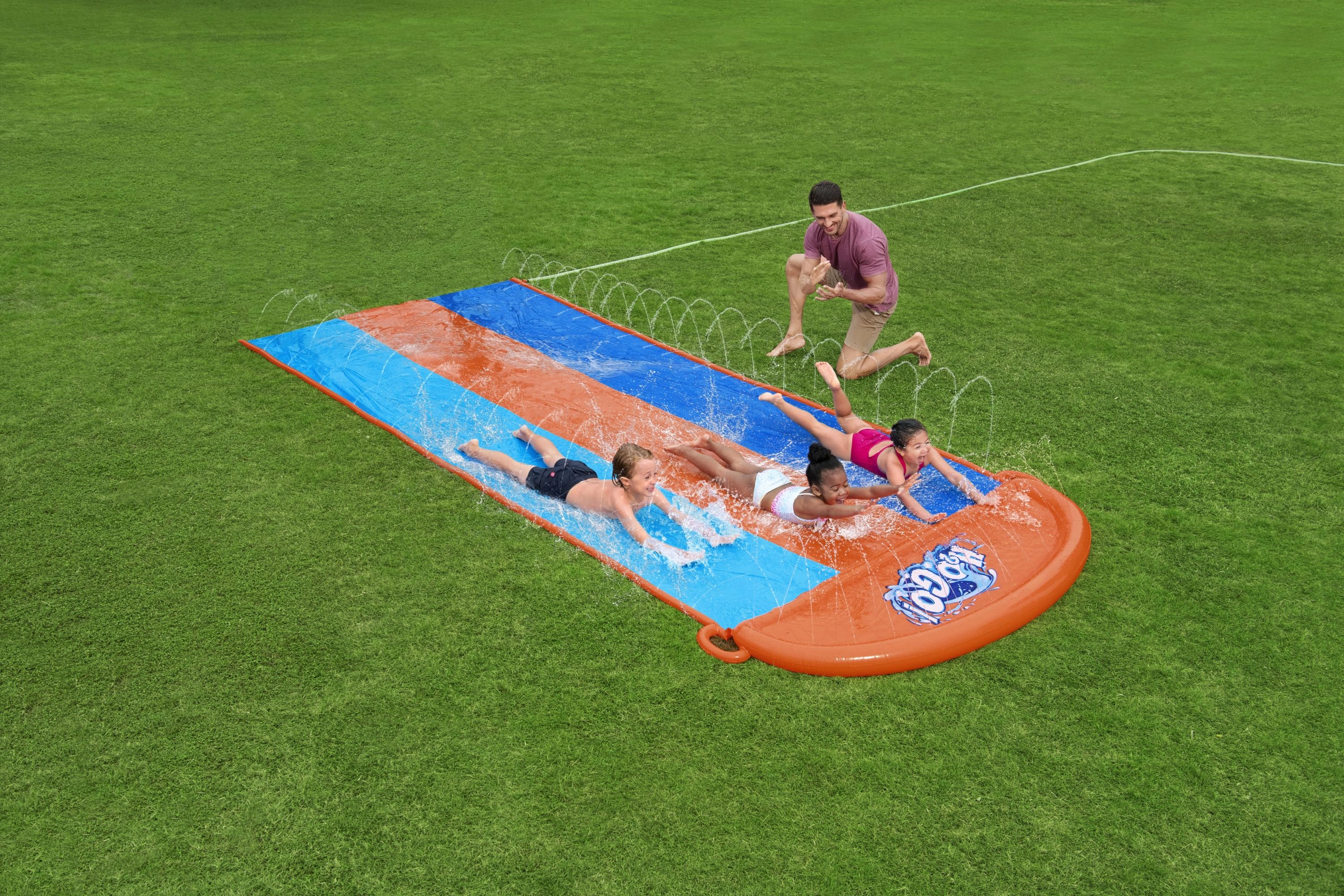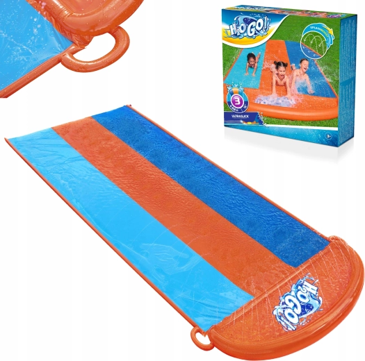 Začnite poletje na polno z vodnim toboganom BESTWAY dolžine 4,88 m in s tremi voznimi pasovi za otroške dirke. Vgrajene stranske prhe ohranjajo površino spolzko – le priključite vrtno cev in zabava se lahko začne. Trpežen PVC material, mehki končni del za pristanek in enostavna namestitev brez orodja zagotavljajo varne in neskončne vodne vragolije za otroke od 3 let dalje.