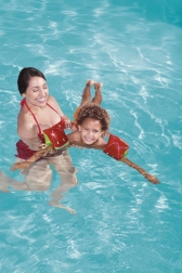 Dve neodvisni komori držita otroka stabilno nad gladino in podpirata pravilno držo pri učenju plavanja.