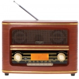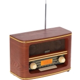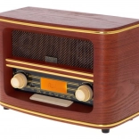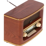 Elegantna lesena izvedba s kovinskimi elementi in preglednim zaslonom ustvarja vtis pravega retro aparata, hkrati pa ponuja čist in močan zvok.