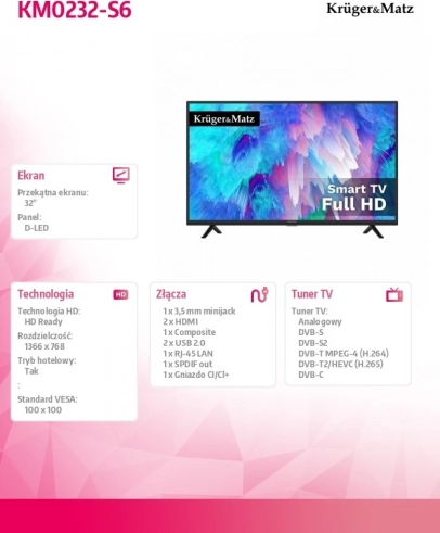 Praktična diagonala 32" je idealna za spalnico, kuhinjo in manjšo dnevno sobo. Ostrina slike v ločljivosti HD je dopolnjena s pametnim okoljem za pretakanje in spletne vsebine. Vgrajeni sprejemniki DVB‑T2/S2 s podporo HEVC zagotavljajo brezhiben sprejem trenutnega in prihodnjega oddajanja.