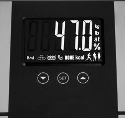 Upravljanje je nadvse preprosto: gumb SET in puščice za vnos starosti (18–80 let), višine (100–220 cm) in stopnje aktivnosti 1–5, izbira profila ženska/moški/športnik ter udobno preklapljanje enot kg/lb/st z gumbom UNIT na spodnji strani. Po meritvi se tehtnica samodejno izklopi po 60 s, s čimer varčuje z baterijo in ostane pripravljena za naslednjo uporabo.