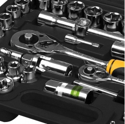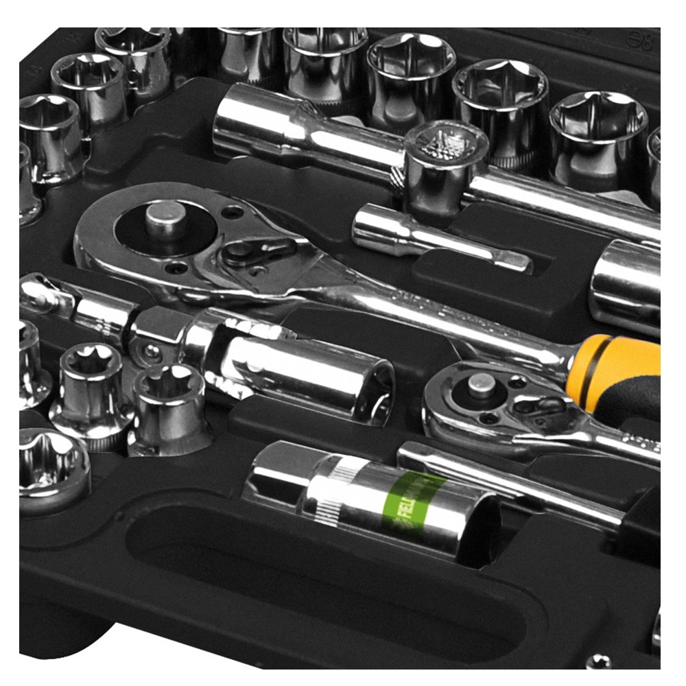 Ta 108-delni komplet združuje najpogosteje uporabljene nasadne glavice, bite in dodatke, zato zlahka opravite montažna in vzdrževalna dela na avtomobilu, kolesu ali v gospodinjstvu. Pregledna razporeditev v trpežnem kovčku zagotavlja hitro orientacijo in varno shranjevanje.