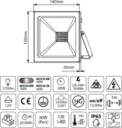 Moč 30 W s svetlobnim tokom približno 2400–2700 lm zagotavlja jasno osvetlitev dovozov, vhodov in delovnih površin, pri tem pa varčuje z električno energijo.